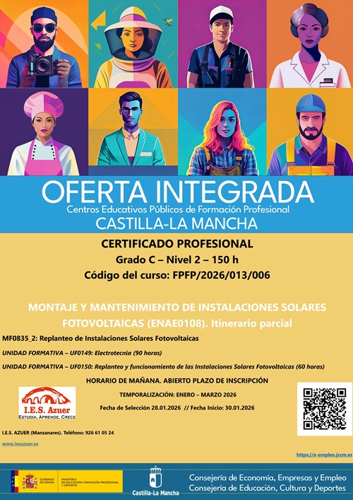 El IES Azuer (Manzanares) abre el plazo de inscripción para el Certificado Profesional de Montaje y Mantenimiento de Instalaciones Solares Fotovoltaicas (ENAE0108), una formación oficial y gratuita, orientada a uno de los sectores con … Leer más
