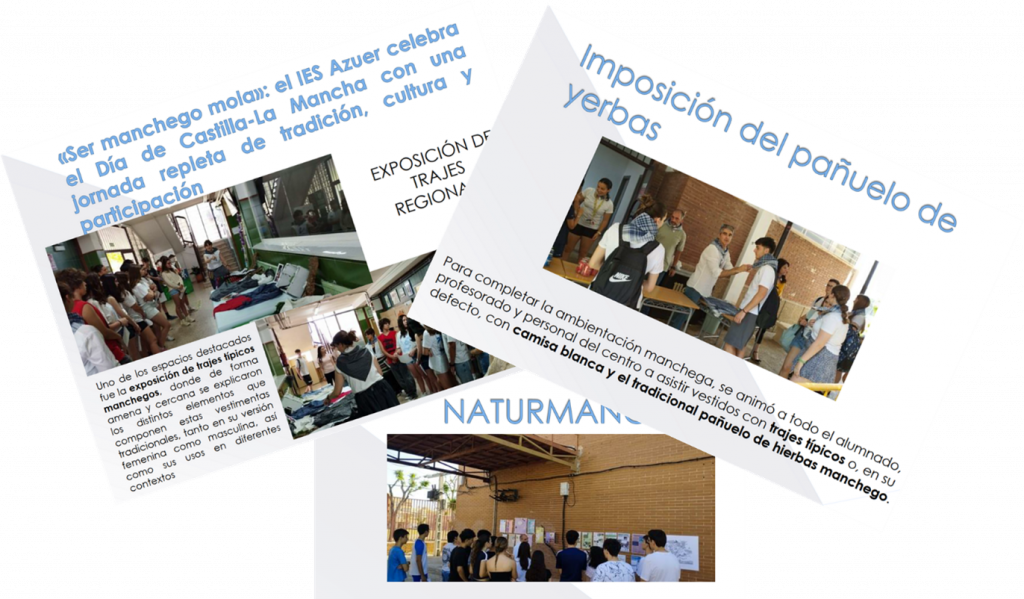 La propuesta presentada por María Navarro destacó por su carácter interdisciplinar y participativo. Tal y como se recoge en la presentación, la actividad giró en torno al lema “Ser manchego mola”, implicando a toda la comunidad educativa en una jornada repleta de talleres, exposiciones y experiencias culturales. Entre las actividades desarrolladas se incluyeron rutas virtuales por Manzanares, recreación de monumentos con materiales reciclados, excursiones al entorno natural de las Lagunas de Ruidera, muestras de gastronomía cervantina, exposiciones de trajes regionales y actuaciones tradicionales.