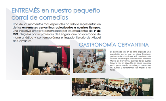 Asimismo, se promovieron iniciativas innovadoras como el uso de herramientas digitales para la divulgación del patrimonio local, así como propuestas artísticas y escénicas que acercaron el legado de Miguel de Cervantes al alumnado de una forma actualizada y dinámica.