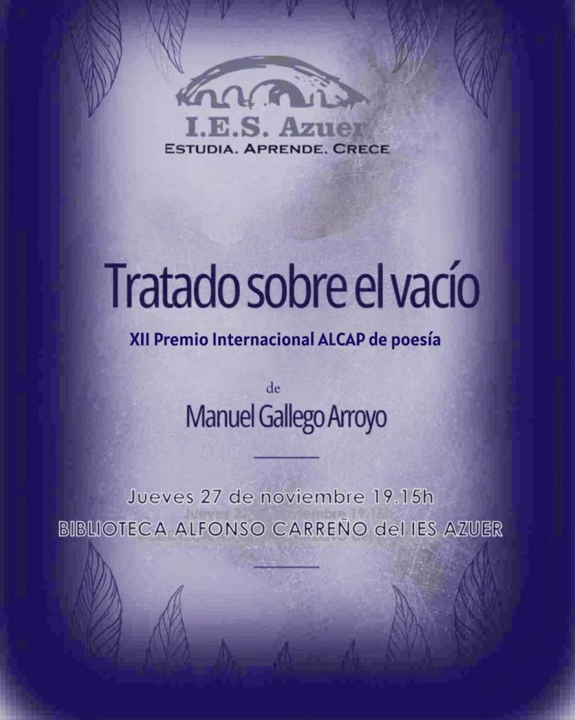 Nos complace invitarles a un evento cultural muy especial que tendrá lugar en nuestro centro. El próximo jueves 27 de noviembre, a las 19:15 horas, se celebrará en la biblioteca “Alfonso Carreño” del IES Azuer la presentación del libro “Tratado sobre el vacío”, escrito por nuestro profesor Manuel Gallego Arroyo, recientemente galardonado con el Premio Internacional ALCAP de Poesía.